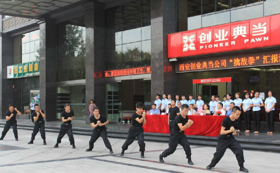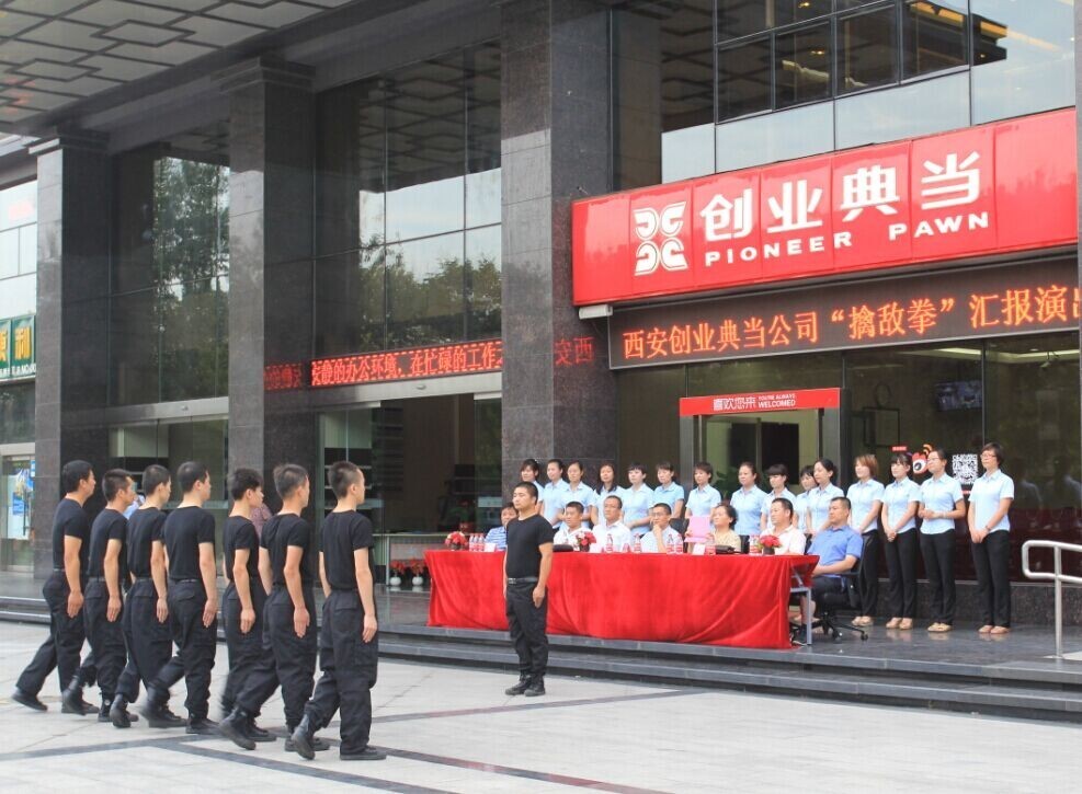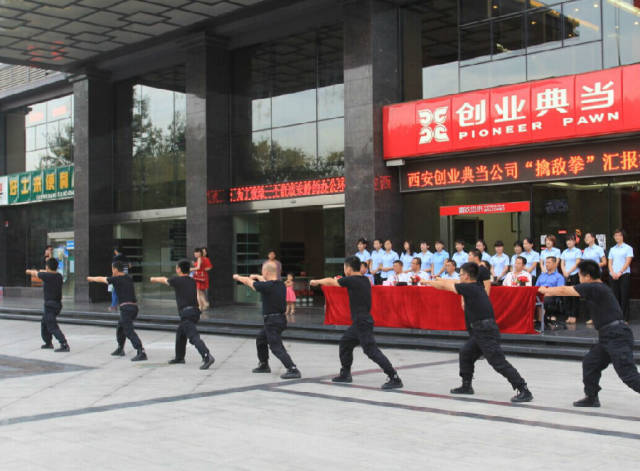8月23日下午,由西安创业典当组织进行的“擒敌拳”汇报演出,在西安创业典当高新店广场上顺利上演。此次汇演,我公司特别邀请了主管领导、西安银行张行长及首位教官刘鹏、员工家长代表张大治母亲廖西婉女士、马攀父亲马俊良先生前来观看;对于此次汇演,张行长及员工家长代表给与最高评价。 从6月份开始,创业典当的男同胞们利用每周末的休息时间,在特警支队教官的带领下,艰苦训练“擒敌拳”。从最初的齐步走,到列队,再到每天都会练习的一整套擒敌拳,他们艰苦的付出,在这一刻得到了最大的回报。 看看他们的每一个动作都如此的卖力,阳刚气概十足 帅气的站姿 非常感谢各位的到来,感谢你们能从百忙中抽出时间亲临创业典当现场指导,我们也非常感谢未能到场观看的特警队教官王兴、刘硕,感谢你们对创业典当的关注与帮助!你们是我们前进的动力。