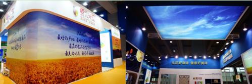 恒大兴安的展区位于展会入口处的黄金位置,整个展区随处可见金灿灿的水稻装饰原色,内部天花板设计以蓝天白云为主题,让参观者犹如置身于大自然之中。