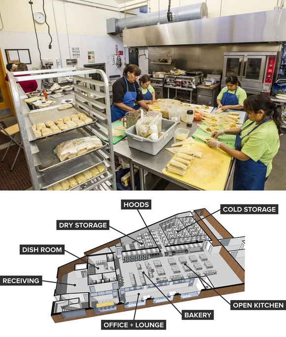 (一般厨房孵化器的外观和平面图) 这些孵化器规模各异,侧重点不同,遍布美国主要城市。 这一行的老前辈、2005年就已经成立的La Cocina主要是帮助拉丁裔的创业;威斯康星洲的Farm Market Kitchen主要的客人则是农民群体;新泽西的Rutgers Food Innovation Center和学校合作,侧重包装产品而非餐厅;俄亥俄州的Food Fort专注于近几年非常时髦的小吃车项目;纽约长岛的Organic Food Incubator——看名字就知道,做有机的,而且非常擅长于提供包装物流;费城的Center for Culinary Enterprises专注于烹饪教学,他们的厨房教室直接就是一个电视摄影棚;华盛顿的Union Kitchen最近更是开始接餐厅的生意了,那些临开业前需要彩排和模拟的,或者经营期间想要试水新菜单的,都可以来找厨房孵化器,而且不少餐厅还把孵化器里看到的“同事”们的好产品最后一并带进餐厅里使用了。