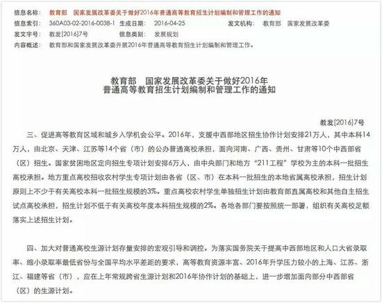 这样的政策目标实现的重任没有落在像北京、上海这样高等教育资源丰富、录取率高的地区也是让人感到百思不得其解的原因。劫穷济贫,拆一些人口大省高考大省高校生额的东墙,去补另一些人口大省高考大省高校生额的西墙,不仅不是在促进教育公平,而且只会使得京沪等高等教育资源充沛的“百分之一”地区和全国其他“百分之九十九”地区之间,教育机会不平等的沟壑变得愈来愈深。这种固化强化地域矛盾的高等教育资源调控方案,不管造成的原因有多少种有多无奈,成因有多复杂多不可控,动机有多合理,都应该考虑再次检讨和评估了。 江苏和湖北两省人口众多,考生数量庞大,历来都在高考竞争最激烈、分数线最高,也是全国录取率较低的两个省份。从这两个省拿走近8万高校入学名额调控给同为人口大省高考大省的河南广西江西等省市,来提高它们的高考录取率,这完全是劫贫济穷的做法。促进教育公平的目标,如何实现呢? 2016年部分地区跨省生源计划调控方案。来源:教育部官网 通知文件相关部分截图。来源:教育部官网作者:丁维莉 来源:知识分子 今年1月,只存在了3天的A股熔断机制似乎预示了2016年会有很多让人百思不得其解的方案出台。五四青年节,离高考1个多月,成千上万的中国家庭最关心的高考名额分配出现了重大的调整,先看部分原始文件: 2。 “…高等教育资源丰富,2016年升学压力较小的上海、江苏、浙江、福建等省(市)…”这一句话特别可圈可点。 其三,高等教育资源最丰富,2016年升学压力最小的北京市,被调剂名额没有列入表格里,假设为零。 再看对应原始文件的图表: 这就好比有两家门对门的穷人,以前穷到家里都没有凳子。现在有一家努力赚钱以后添了第一只凳子,如果我们去这家敲掉一只凳脚,调控给还没凳子的那家,这公平么?解决了什么问题?