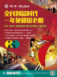 此优惠不可与其他优惠同时享受,本活动最终解释权归开发商所有 不过这么好的机会可不是人人都能抢到的,【限!量!10!套!】,想致富先买铺抢起来!限时限量劲惠让利,财富机遇不容错过!【伟东湖山美地】财富热线:66870777~ 全民创富时代 一年免租做老板 搜狐焦点网提供伟东幸福之城销售电话:400-898-3527 号外!号外!一个商业大事件震惊青岛,伟东湖山美地临街旺铺全城寻找大BOSS,商铺12个月免租权大放送!无本生意经营,机会千载难逢。 >>>>>>>点击 进入伟东幸福之城论坛 项目位于黑龙江中路与金水路黄金主干道交汇处,紧临李沧首所公立名校——青岛市实验二小,占据投资升值黄金地段,人潮涌聚带来无限财富!周边万达、乐客城商圈辐射,客流大量导入,潮流消费新高地即将崛起! 旺铺地址:青岛市李沧区黑龙江路680号 总占地约16万㎡,总建面约42万㎡,小区总规划3500余户,预计未来居住人口超1.5万人。再加之核心住区周边聚集众多社区,如金秋桂园、百通馨苑、阜康花园等,汇集10多万常住人口。依托社区的超旺人气,伟东湖山美地商业街必然吸金无限,且周边业态丰富和成型的商业街较为缺乏,物以稀为贵,吸金商业更是如此!无限前景,指日可待。 注: NO.3吸金现铺即买即用,一铺聚富养三代 NO.1李沧CLD核心住区,旺盛消费力保驾护航 NO.2市级公立名校一墙之隔,旺铺吸金商机无限 一次性租住3年免租1年,限量10套,先到先得