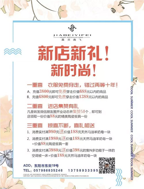 本店于2016年8月20正式开业,多重活动等着您: 一重喜 衣服免费穿走,错过再等十年! A、充值3800元即可免费穿走价值688元以内的商品 B、充值6800元即可免费穿走价值1388元以内的商品 二重喜 进店集赞有礼 凡是转发微信朋友圈开业动态并集赞58个,即可到 店领取一份价值88元的精美陶瓷餐具一份 三重喜 惊喜不断,喜礼相送 1、消费实付满980元送价值188元天然马油羊奶皂一块 2、消费实付满1980元送价值188元天然马油羊奶皂一块 +价值88元陶瓷餐具一套 3、消费实付满3980元送价值398元的集N多功能于一体的空调被一床+价值188元天然马油羊奶皂一块 活动截止时间:2016.8.20-2016.8.28