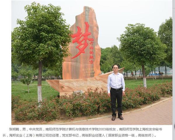 据悉,上海校友会自筹备以来,经历数月五次筹备,已经形成较为完善的校友会组织架构,凝聚了在上海工作的校友近200人,锻炼了一批热心的骨干力量。并常召开校友工作总结会会议,就校友机制管理等方面总结工作方法,探求创新思路。同时定期举办校友联谊活动,为来沪创业的校友打造了一个绝佳的平台,营造了一个温馨的港湾,真正让师院人在外地找到了家一般的归宿。 在师院的日子里,他一直高标准要求自己,为提升自己而努力拼搏。离专升本还有1个月的时间里,他除了在学院学生办公室协助整理当年将毕业的几百人教师资格证的相关手续,同时还废寝忘食,积极备考。终于,艰辛的付出终于有了回报,在2006年的专升本考试中以193分(当年建档线80分)的成绩升进入了西亚斯国际学院。假如没有三年的艰辛付出和努力拼搏,恐怕也不会有那么多收获。 近日,海郑实业总经理张明鹤的创业经历,这个在辛东方跟踪四年有余的企业家的创业过程和故事却在脑海中无意间浮现出来。 梦开始的地方 张明鹤,在南阳师范学院期间,担任班干部,积极参加各种社区活动,锻炼实践操作能力。几年的大学生活,极大丰富和开阔了视野,为他以后创业埋下了伏笔。这一天不会太久,一切都在时间的印证中慢慢进行和酝酿着。 正是抱着极大的热情,对家乡的深深眷恋,以上海和郑州名字各取一字组合成“海郑”,这也是海郑实业(上海)有限公司企业字号的依据和渊源。 不忘曾经在南阳师院的峥嵘岁月,当年南阳师范学院“育英杯”双语比赛、经典诗朗诵比赛、大学生辩论赛、校园歌手、主持人、舞蹈、健美操、曲艺大赛等各种校级比赛的活动现场,都有他积极的身影。 互联网时代变化莫测,商机与风险同在。无论如何,这都是一个创业的时代,一个机会不可多得的时代。用海郑实业总经理张明鹤的一句话:创业需要努力和坚持。 互联网是一个巨大的创业平台,2015年第二届世界互联网大会的召开,更加坐实了互联网创业时代的巨大商机。把握互联网时代创造的巨大价值,抓住机会,干一些自己喜欢做的事情,何乐而不为呢!至少不虚度此生! 任何公司在成立之初,都是由几个合伙人开始的,这是不可否定的事实。事实上,并不是所有人都适合做合伙人。合伙人,这不是一个简单的概念,而是集合所有资源人脉圈子心胸宽广大气有原则的最终结晶。合伙人,是精华、智慧、人品、忠实、信仰的结晶。 2008年,在那个长三角氤氲着梅雨的季节,刚走出大学校门的张明鹤怀揣创业梦想,凭着在大学校园里积淀下的过人胆识,只身奔赴长三角,勇闯上海滩,来到了这个创造无数传奇故事的“十里洋场”,开始了他艰辛的创业之路。创业之初的他品尝了人生路上的酸甜苦辣,胆略过人的他最终通过坚毅付出,收获了创业成功的累累硕果。