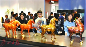 舆情热点 市民在欣赏湖南艺术家创作的铜胎漆器马。 据统计,本届广州艺博会35%的参展商皆是首次参加,这两天近8万的人流量和2亿元的成交额,让他们纷纷感叹,南国艺术市场比想象中要火爆很多。
