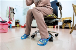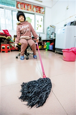 无法直立行走,思思只能借助带有滑轮的椅子“忙前忙后”。
