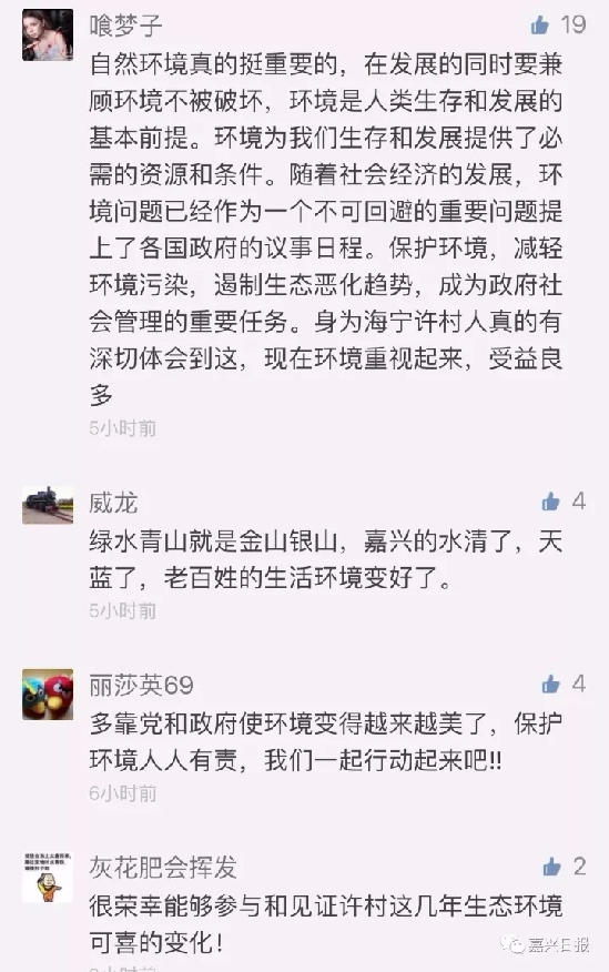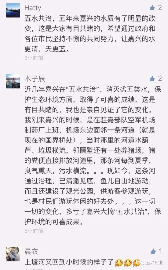 昨天,一位土生土长的许村人向我们讲述了关于嘉兴最后一个劣五类断面消逝的故事。粉丝们看来也很有感触,纷纷用自己质朴的语言为这几年嘉兴在“五水共治”和改善生态环境方面取得的成绩,主动留言点赞~