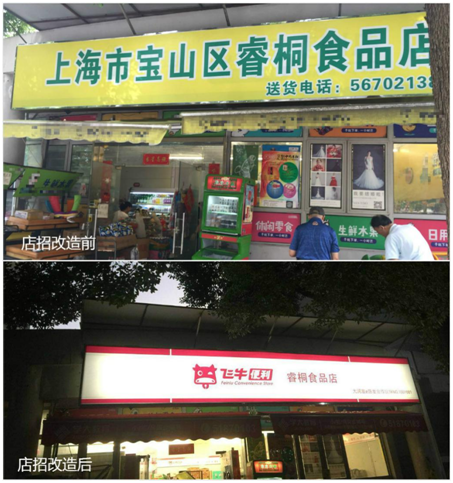 (收银台改装前后对比) 升级后的睿桐食品店店面焕然一新,王小英指着门口“飞牛便利”的招牌笑着说:“这对我们来说可是个福音啊,跟你们合作以后我们就可以更省心啦。以后商品你们帮我们挑,货架陈列你们来指导,运营模式你们来提供,我们笑着数钱就好了嘛。” |