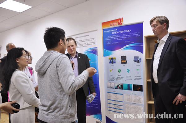 ▲柒水科技有限公司创始人、我校在读博士生董宗师介绍公司核心产品水下机器人(DTECH-1型ROV) 在随后召开的座谈会上,相关部门负责人解读了我校“创新、创造、创业”的“三创”教育理念及多层次、立体化的创新创业教育教学体系。近年来,我校大力推进创新创业教育与专业教育的深度融合;启动“武汉大学自强创业班”建设计划;推进“书院制”建设,深化基础学科拔尖人才培养模式改革;加强学生创新创业指导,培育一流大学生学术创新文化;不断丰富和拓展学生创新创业实践形式;打造一流工程训练和创新创业实践中心;修订本科生管理工作系列文件,鼓励为学生参加创新创业实践。 瑞方四位青年代表现场分享了他们在“青年成就”项目支持下的创业经历。初创于1919年的“青年成就”是全球最大的致力于青少年职业、创业和理财教育的非营利教育机构。去年全球有1000万学生参与相关创业活动,仅达拉纳一省,26所学校就有23所学校的学生参与。