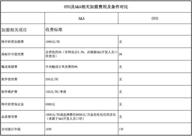通过访问国内其他连锁品牌酒店官网及拨打加盟热线,环球旅讯发现,OYO目前在国内与尚美生活集团旗下连锁品牌A&A互联网连锁酒店(以下简称“A&A”)的加盟模式十分类似。两者对外皆宣称采取了轻改造、低收费的加盟模式,且根据地段实际情况,平均客房单价在100-200元之间。 据A&A开发人员表示,A&A为尚美生活集团在去年下半年推出的全新加盟方案。同样在去年下半年启动,OYO迅速扩张的脚步似乎让A&A望尘莫及。面对OYO在广州已上线十余家加盟酒店,而A&A只有一家加盟酒店的反差,A&A开发人员坦言称,OYO在中国确实发展的比较快。 通过对比OYO和A&A的加盟模式(详见下表三)及相关调查分析,环球旅讯认为加盟门槛低是OYO迅速扩张的主要原因之一。