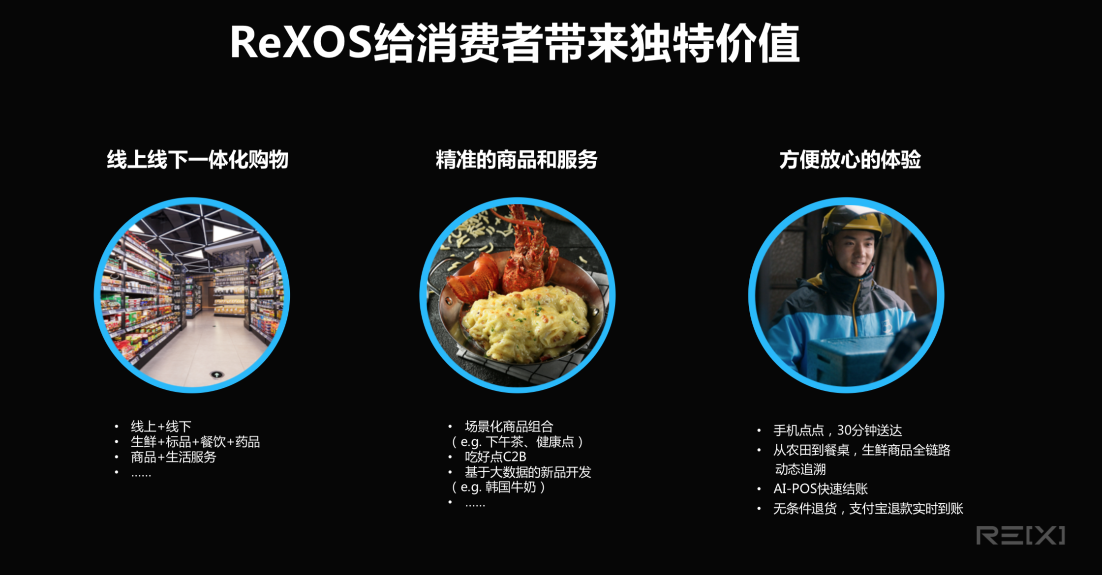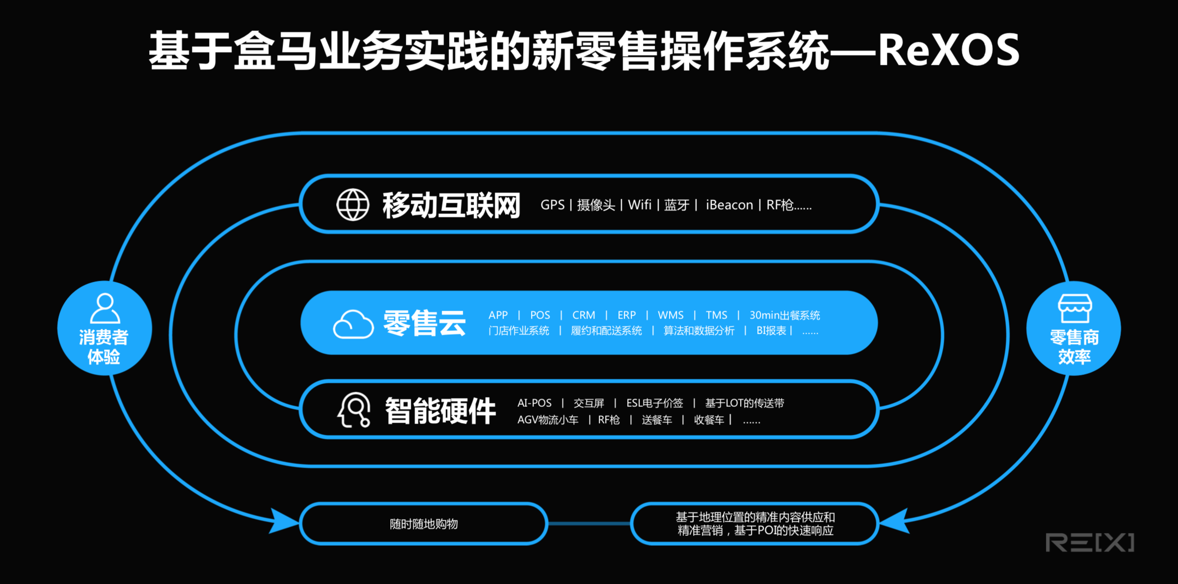 ReXOS集盒马能力之大成 ReXOS能力输出对零售业意味着什么? 侯毅称,盒马是科技、餐饮、物流、零售完美的组合体,“这四者的有机组合才使跨界运营、效率、成本得到根本性改善。” 盒马的新零售是建立在数据基因上,通过数据掌握消费者需求,反向驱动商品采购、中央厨房、加工中心、配送等环节的精准供应和流通效率,最终实现3公里范围内30分钟免费送达的智能物流体验。“这是一套颠覆传统零售的运营体系。” 阿里云总裁胡晓明说。 盒马衡量运营的四大指标中,除人效、坪效这两个传统指标外,时效、流效(商品流动的效率)是盒马独有。这是基于盒马对新零售的认知:线上订单需要即时响应、精准控制;而实现商品从源头到消费者手中最短链路、最快时间,则是盒马智慧供应链的核心能力。