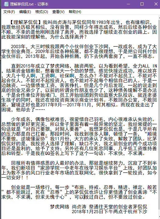 【猎云网杭州】1月27日报道(文/盛丽艳) 1月25日早晨,80后创业代表人物茅侃侃自杀身亡的消息在朋友圈传开。从曾经与李想、戴志康、高燃并称“京城IT四少”,到离开人世,他的经历让人扼腕叹息。也引来了不少人,对创业深度思考。 尚贞涛就是其中一位,他与茅侃侃同年出生,同年创业,同样少年成名,之后又连连失意。 联系上尚贞涛,是因为他写了一个祭文“理解茅侃侃 敬重茅侃侃”,在访谈中,他从自己的经历出发,讲述了创业者光鲜表面背后的撕裂人生。
