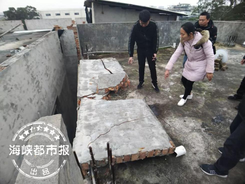昨日上午,记者在事故现场看到,事发的民房为水泥结构,共四层。四楼天台地面上多处钢筋裸露,四周用水泥围墙围起,墙高约1.2米。其中一面,有一段约3米长的围墙倒在了天台上。倒下的围墙开裂、断开,现场能明显看到血迹。