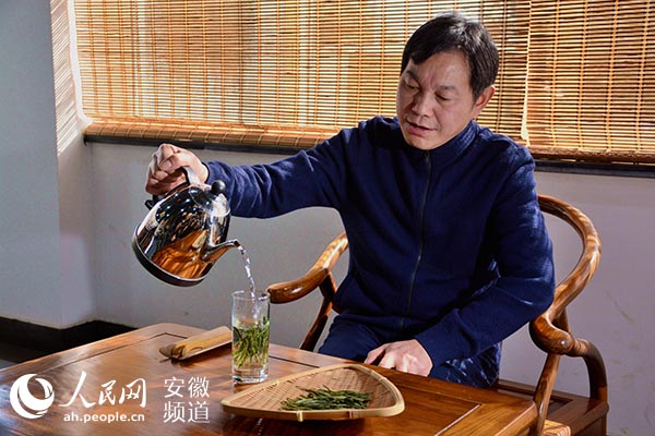 取几片茶叶,投入经沸水洗涤过的杯中。接着倒入90度左右的开水,先续水三分之一,透过玻璃,只见嫩绿的叶片吸收了水分逐渐变软,云烟袅袅的水汽中弥漫着淡淡的兰香。随后,续入余下三分之二的水,茶叶随水流跳动,最后立于水面。此时的茶叶在水波中舒展开来,犹如春风拂绿的嫩叶,在水中静静地呈现。 “八九十年代,市场上很难找到正宗的太平猴魁。”方继凡告诉人民网安徽频道记者,90年代前后,他在南京的茶行里看到苦丁茶被当作猴魁出售。而在北京,很多茶商错把毛峰当成猴魁。 方继凡茶艺表演 “从2017年开始,猴坑公司与村里的贫困户签订茶叶订购合同,指导他们按照公司种植和制作的规范要求生产茶叶,公司同时承诺三年内按照高于市场价10%至20%的价格上门收购,三年后再按市场价收购,帮助贫困户增收。”方继凡告诉记者。 猴坑村位于太平湖畔,是一个四面环山的山村。虽然正宗的太平猴魁产于此地,但由于大山阻隔,通往外界的山路蜿蜒崎岖,内部很多村组互不通路,只能靠坐船通联。受制于恶劣的交通状况,当地百姓的生活十分困苦。