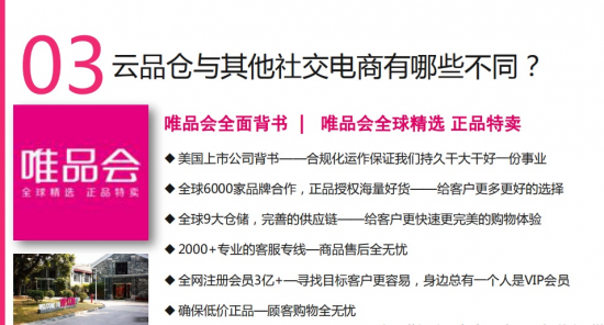 是的,云品仓虽然是唯品会的,但不能光是因为背靠大树这一点,就让大家信赖!事实上,云品仓的优势,绝非仅仅是“云品仓是唯品会的”这一点,云品仓还有更多优势,下面这些优势,才是云品仓之所以能够立足在社交电商领域并不断发展的原因: 一者,微信生态圈:这自不必多说,微信为云品仓敞开大门,而云品仓也完全依附在微信生态圈中,毕竟腾讯是唯品会和云品仓的投资人嘛!云品仓自然拥有无上优势!可以理解!