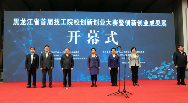 28日,黑龙江省首届技工院校创新创业大赛决赛暨创新创业成果展在哈尔滨举行。 黑龙江网络广播电视台讯 9月28日,由黑龙江省人力资源和社会保障厅主办,哈尔滨市人力资源和社会保障局、哈尔滨技师学院(哈尔滨劳动技师学院)具体承办,哈尔滨市人社局双创社区创业孵化基地、哈尔滨大学生创业孵化园、启创未来(北京)科技有限公司协办的黑龙江省首届技工院校创新创业大赛决赛暨创新创业成果展在哈尔滨举行。黑龙江省委常委、省政府副省长贾玉梅、人力资源和社会保障出版集团副总经理魏丽君、黑龙江省政府副秘书长王有国、黑龙江省委组织部副部长、省人社厅党组书记、厅长黄迎新、哈尔滨市委常委、市政府常务副市长康翰卿、省人社厅党组成员、副厅长于明海、哈尔滨市组织部副部长、市人社局党组书记、局长关世勋出席本次活动。