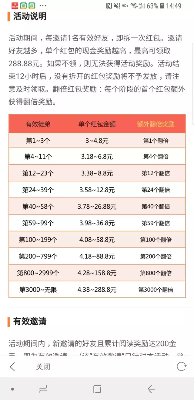 图3.22 趣头条用户增长策略 在个人网赚金币的基础上,趣头条利用“传销方法论”化收徒模式,点对点收徒激励用户不断拉新、发展下线:用户将自己的拉新二维码或者链接分享到微信朋友圈、好友、QQ空间等社交应用中,引导新用户下载激活,一旦好友通过你分享的二维码或邀请码注册了趣头条,你就能够得到一定的现金奖励,多拉多得,不设上限。 不仅如此,师傅用户在拉徒之后,徒弟在端内获得的行为金币奖励也会进贡部分到师傅的账户中,即将师徒之间的行为进行分成强绑定,通过收益进贡,让师傅对徒弟的行为进行强干预,顺势提升徒弟用户的留存、阅读等行为指标数据。 进入2018年,趣头条明显感觉到了竞争对手释放的压力,进一步加大用户补贴力度,每个新增用户只要完成全部新手任务,就可获得大约3.5元的现金奖励。在招股书里,趣头条把这种获取用户和用户留存方式称为“创新的用户账户系统和游戏化的用户忠诚度计划”。 事实上,网赚模式的拉新策略最早起步于积分墙和任务众包平台。该平台直接给安装过此类应用的用户分发任务,刺激用户下载、激活获得返现,达到给对应任务产品引流拉新的目的。趣头条对这种模式进行了改造,它把任务平台的功能直接嫁接到自身的产品上,去掉任务平台这个中间商,直接击中用户贪小便宜的心理。同时,师徒拉新策略具有点对点沟通、实时拉新实时现金到账的优势和特点,由于是拉新激活成功后才给予奖励,可以明确做到一个实际拉新成本对应一个新用户下载,保证了投放成本的完全可控和可预期。 而在此之后,此类资讯应用在师徒拉新上又增加了阶梯奖励等辅助玩法,即邀请人数越多,达成某一个目标值后可领取额外奖励,来进一步刺激有能力拉新的用户拉到更多的人以获得更多的物质奖励,示例如图3.23所示。