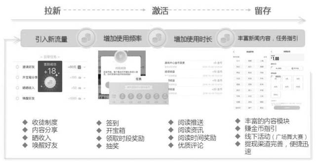 很多人都分析过趣头条的商业模式和获取用户的策略,有一个共同的认知:网赚模式是趣头条初期获取用户的撒手锏。趣头条将现金激励融入拉新、激活、活跃、留存等一整套用户增长流程,搭建完善的金币系统。注册、签到、阅读新闻、邀请好友(收徒)、分享新闻都可获得一定数量的金币激励。在这套金币系统里,金币与人民币的汇率每日都会上下浮动,趣头条将这个汇率与广告收益挂钩,广告收益越高,金币就越值钱。图3.22是媒体绘制的趣头条用户增长策略,可以明显地看到金币在整个增长模型中的核心作用。