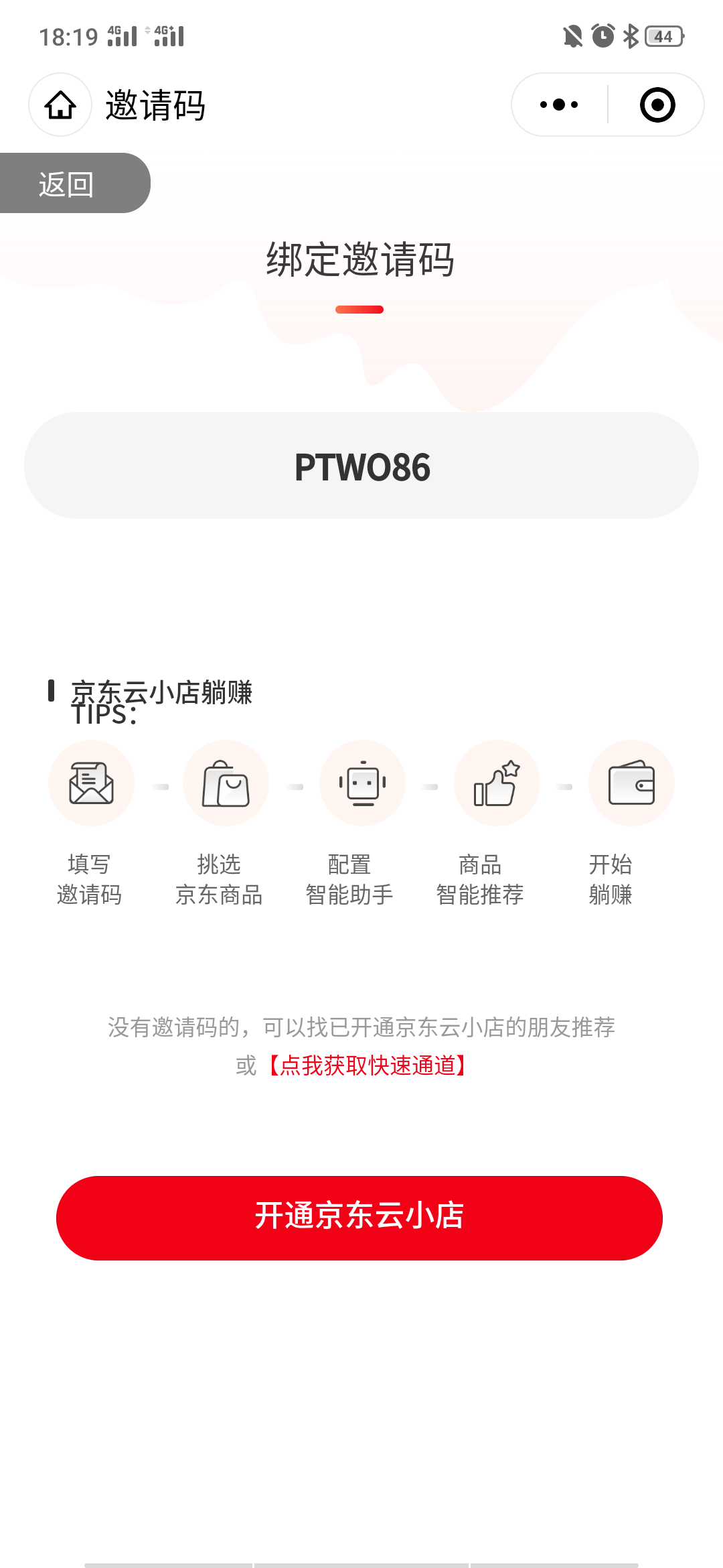 想要在上班的8小时外发展一份副业,又担心没有足够的时间和精力去经营,反倒影响主业发展?对于有类似顾虑的人来说,不妨考虑趁着下沉市场正在爆发的契机,成为一名社交电商店主。而在社交电商领域新近出现的京东云小店就是一个值得尝试的0成本创业项目,正受到越来越多副业投资者的青睐。 虽说这是一个0成本、低风险、人人都可参与的创业项目,但哪些人相对来说更适合在这个领域发展副业呢?简单来说,你拥有的社交资源越丰富、种草能力越强,那么你就越适合当一名京东云小店店主,强大的私域流量变现能力会让你拥有相当不错的收益。 与社交电商前期流行的拼团购模式最大的不同之处在于:京东云小店的店主不仅能在购物时享受海量商品的专属优惠,还可通过向微信群、朋友圈等社交渠道分享优质商品刺激购买来获得实时分红收益。可以说,这是一个自购省钱、“种草”赚钱的低风险创业项目。 京东云小店能卖哪些货? 0 (京东云小店开店申请页面) (扫码了解京东云小店) 由于所有订单均直接进入京东后台,由京东平台提供物流和售后服务,所以店主无需付费备货,只需在店铺后台导入自己认为值得推荐的优质商品,并在社交软件上进行分享即有机会获得收益。 目前,京东云小店的开店方式为邀请制。平台官方近期向普通消费者发放了邀请码福利,用户只需在京东云小店微信小程序等平台输入邀请码PTWO86,即可一键完成开店创业流程。用户也可以选择从已成功开店主处获取邀请码,申请免费开店。 如今,“分享经济”已经得到越来越多投资者的关注,私域流量正变得越来越有商业价值。将自己发现的优质商品推荐给身边的人,在分享的过程中获得收益,既不影响正常的工作,又能朝着财务自由的目标更进一步,何乐而不为呢?