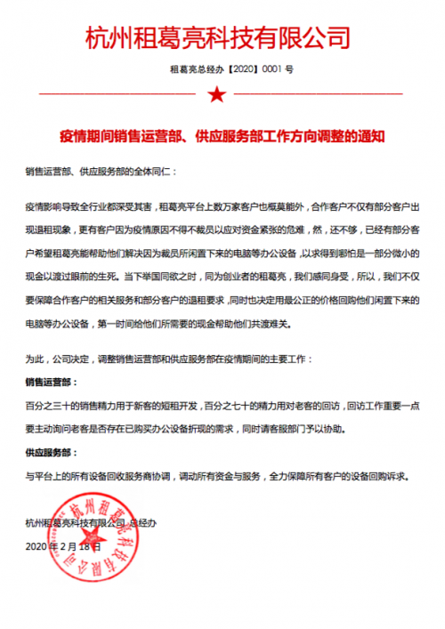 疫情当前,很多创业公司都在生死线上挣扎。2月21日,国内领军的办公电子设备租赁平台---租葛亮,宣布发起回购计划,帮助疫情下的创业公司们渡过难关! 为此,租葛亮已经调整了运营部和供应服务部在疫情期间的主要工作:租葛亮销售运营部30%的精力用于新客户的短租开发,70%用于老客户的回访,主动询问是否存在已购办公设备折现的需求。同时,租葛亮供应服务部已开始与平台上的所有设备回收服务商协调,调动所有资金与服务,保障客户的设备回购诉求。 作为国家发改委“信易+”联盟首批成员单位,“让创业更轻松”正是租葛亮的企业使命。突发的疫情对不少企业的生存造成了巨大的危机,危机也将重组市场格局。租葛亮希望通过其企业免押租赁服务以及企业回购服务帮助更多的企业撑伞,帮助他们度过寒冬! 租葛亮发起回购计划 疫情下帮创业公司渡难关 作者:网络 分享 “春天必将到来!中小企业生死存亡这一战,我们一起打!” 转载请注明出处。 租葛亮负责人表示,疫情发生以来,公司的很多合作客户出现了退租现象,更有客户因为疫情原因不得不进行裁员以应对资金紧张的危难。其中,有部分企业客户希望租葛亮能够帮助它们把因为裁员所闲置下来的电脑等办公设备进行回收,以求得到哪怕是一部分微小的现金以渡过眼前的生死关头。 为了帮助租葛亮平台上的用户,以及其他企业用户,租葛亮决定发起这项援助活动 —— 在既满足用户退租需求的前提下,同时又用最公正的价格回购企业用户当前闲置下来的电脑等办公设备,第一时间为创业企业释放所需要的现金流,帮助它们渡过难关。