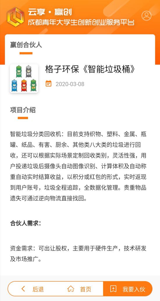 同时,团市委动员全市各级团组织积极对接青年(大学生)创业园,广泛收集青年大学生创业项目合伙需求,集中发出合作邀约。目前,平台已发布“智能垃圾桶”“智慧路灯系统”“在线翻译”等青年大学生创业项目合伙需求。 “赢创合伙人”项目依托“云享赢创”成都青年大学生创新创业服务平台实施。该项目主要功能是通过优化创业要素资源配置,促进能力互补、知趣相投的青年大学生创业者达成合作。作为创业项目发起人,可以通过平台发出资金、服务等合作邀约,寻找项目合伙人。想成为项目合伙人,可以携技术、商机等优质创业要素精准匹配项目,组队成为伙伴,助力实现资源共通、优势互融、合力共赢。 大学生创业初期往往遇到市场评估不足、技术迭代慢、资金链紧张等问题,制约了项目进一步发展,近日,团市委搭建“云享赢创”成都青年大学生创新创业服务平台,启动“赢创合伙人”项目,推动技术、产品服务、人力资本、商机等创业要素在线精准对接,为青年大学生创业项目和合伙人牵线搭桥。