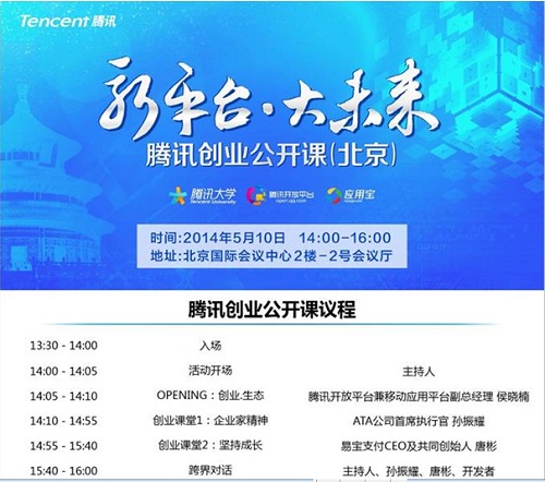 ——5月10日腾讯创业基地公开课(北京)火热报名中 腾讯创业基地首场公开课,即将于2014年5月10日下午在北京举办,特邀孙振耀、唐彬等两位嘉宾担任讲师。孙振耀曾被誉为“中国职业经理人的榜样”,曾在惠普工作25年,并担任惠普公司全球副总裁、大中华区总裁等职位,现任ATA公司首席执行官;另一位嘉宾唐彬是互联网金融前瞻者、易宝支付CEO及共同创始人。两位嘉宾将分享自己的职业成长,并围绕“新平台、大未来”的主题,来与腾讯开放平台的创业者来一次敞开心扉的对话。