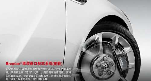 全新君威GS采用意大利Brembo原装进口四活塞刹车卡钳,度身定制的四个活塞的“定钳”式设计使得刹车片压力非常均匀,令整个刹车系统的响应更加迅速。同时,其拥有更好的热衰退特性,刹车片的磨损也更加均匀,带来更良好的踏板感受,为操控性和安全性带来双重裨益! |