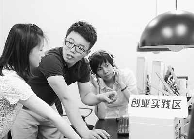 北京交通大学毕业生都小杰(中)在工作室为打算自主创业的学生介绍创业经验。